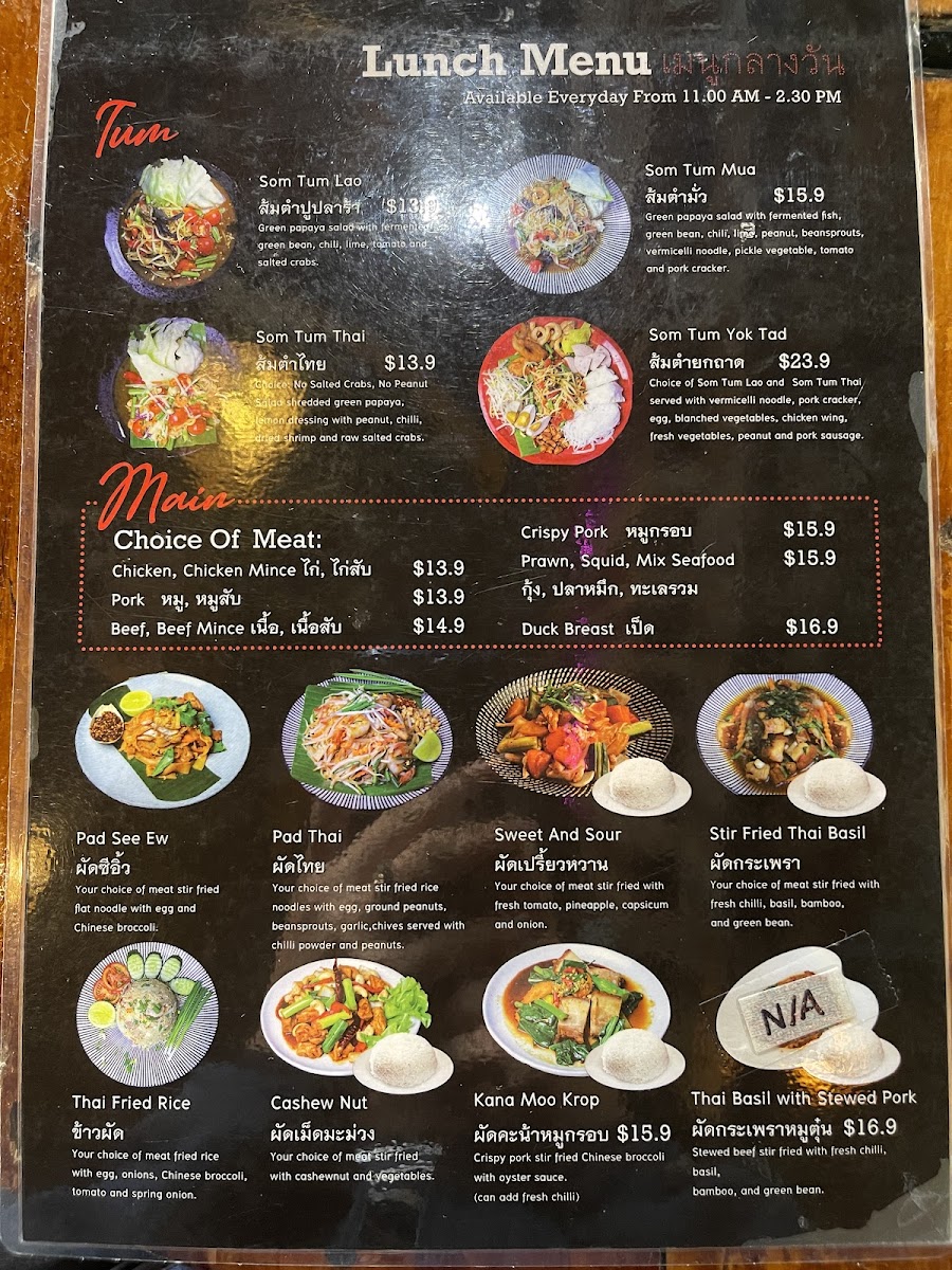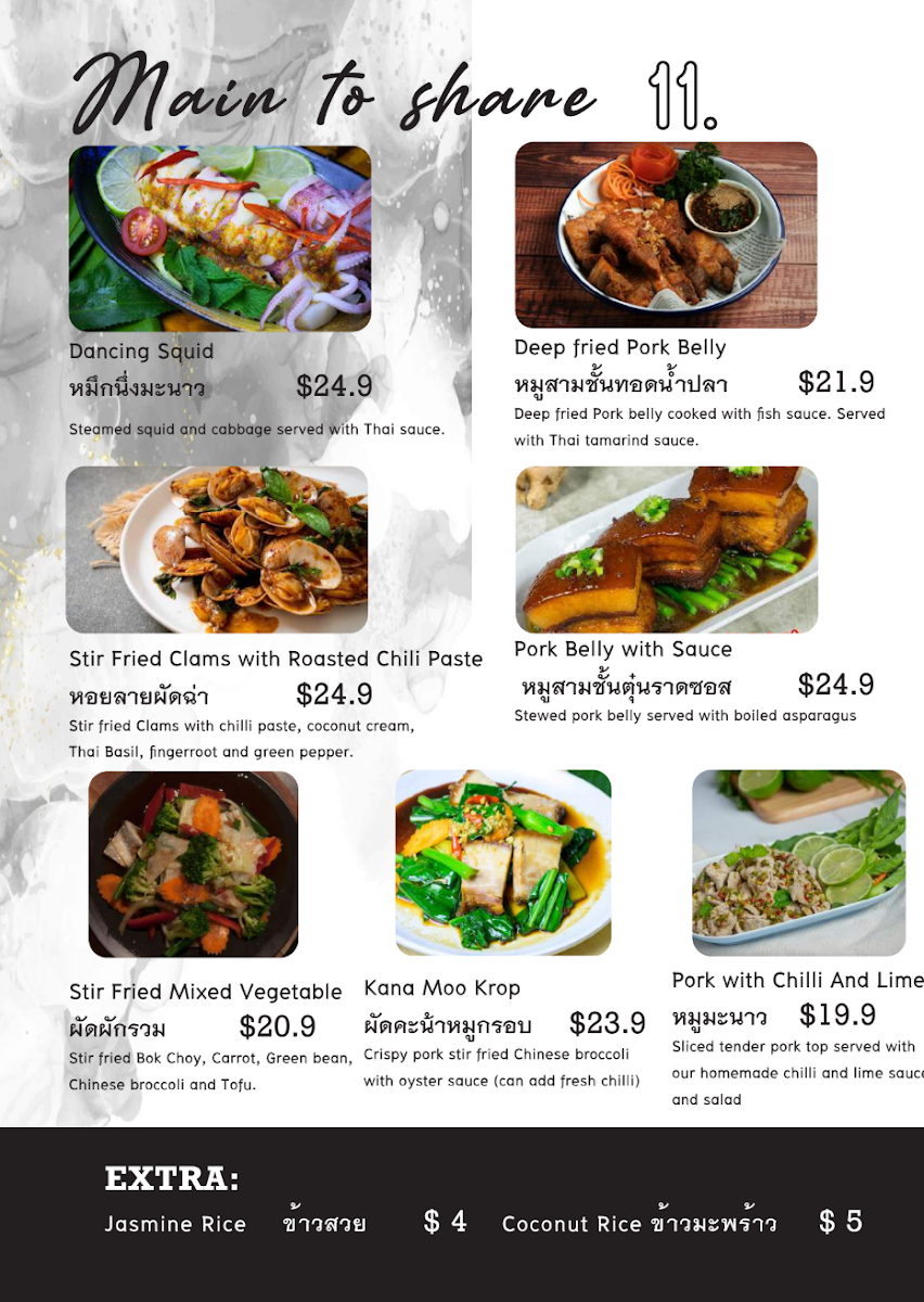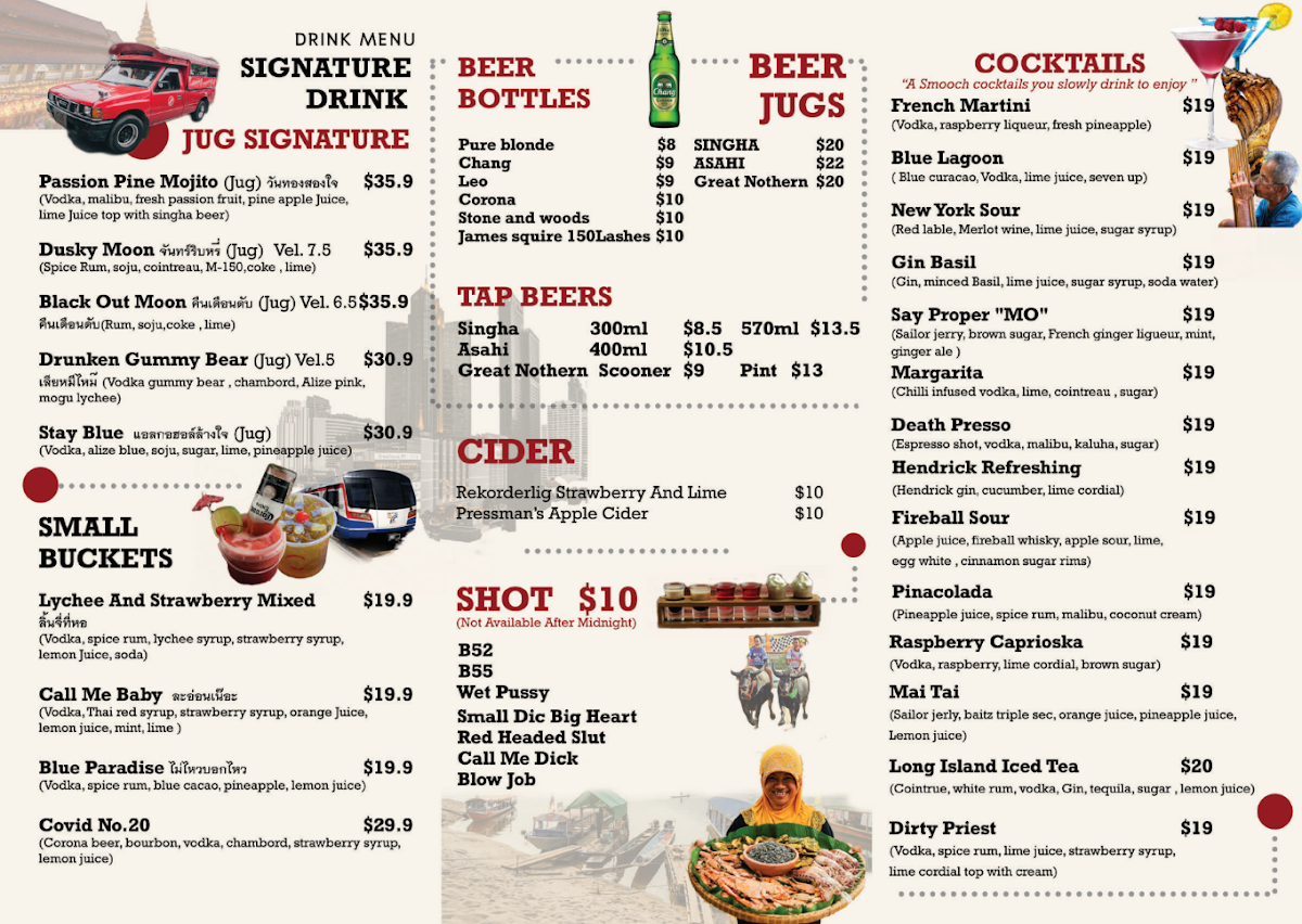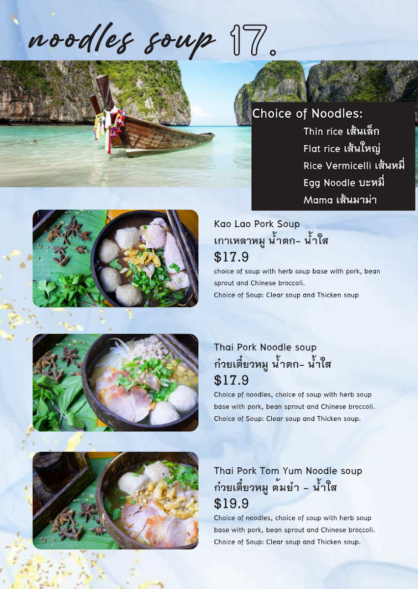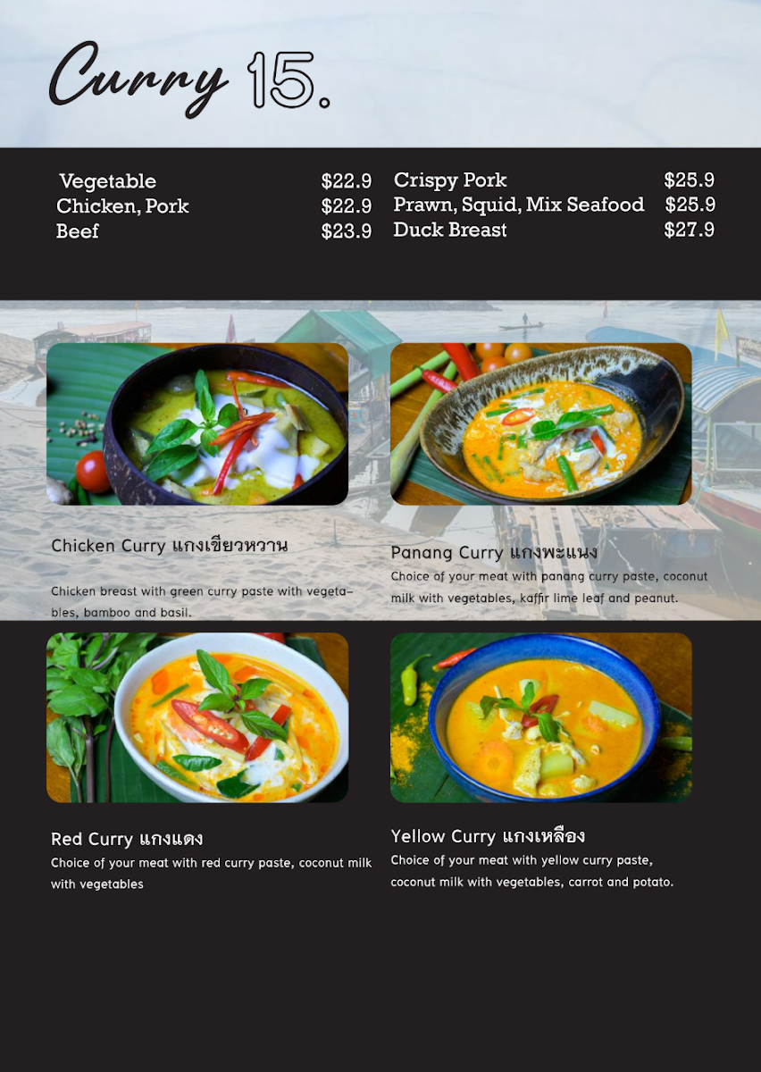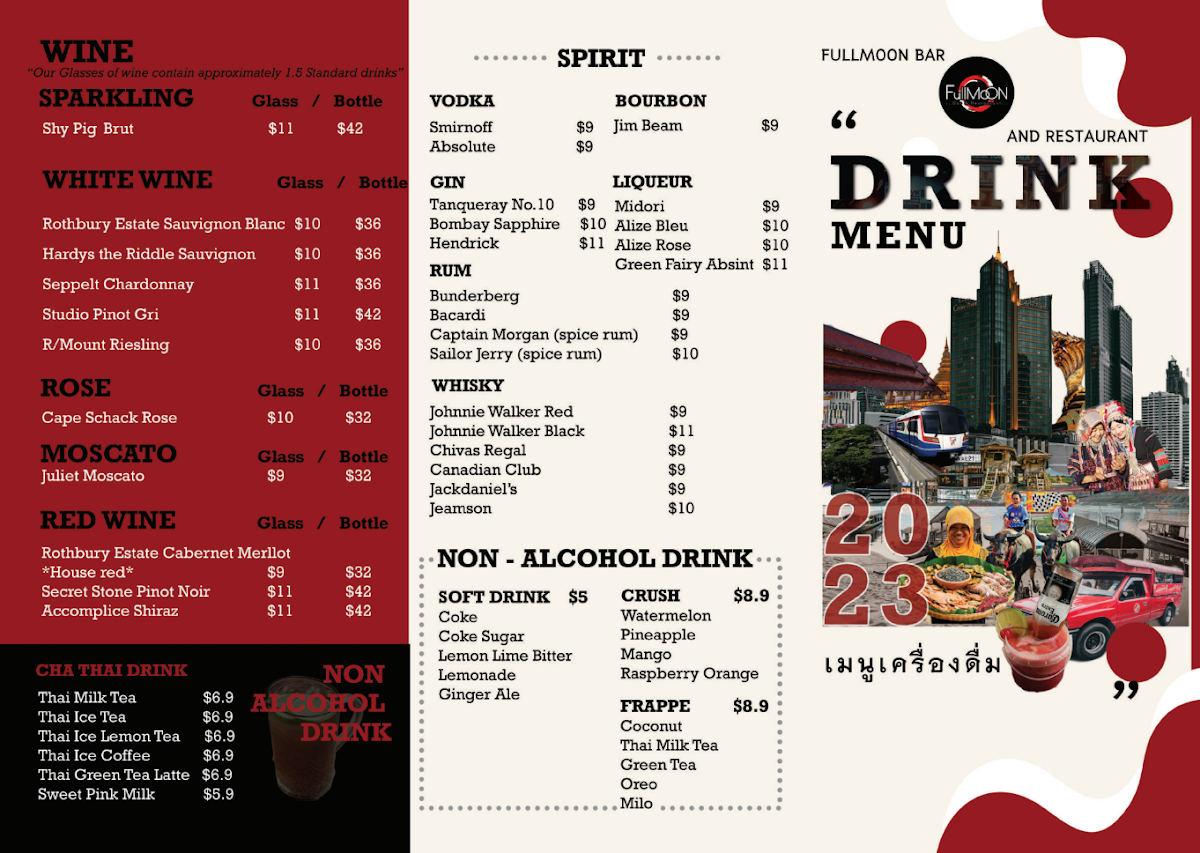 The menu at Fullmoon Bar & Restaurant offers a delightful array of Thai-inspired dishes with a variety of options perfect for sharing or enjoying individually. Start your meal with hearty Tom Yum Seafood Soup or the comforting Hot and Sour Curry Barramundi soup. For noodle lovers, the Tom Yum Noodle and Kao Lao Pork Soup are must-tries. The main dishes for sharing include flavorful Duck Red Curry and Massaman Beef, alongside others like Tom Kha Chicken and Panang Curry. If you're craving something lighter, the Glass Jelly Milk dessert provides a refreshing end to the meal. The vibrant Som Tum offerings such as Som Tum Yok Tad and Som Tum Khao Seafood are perfect for those who love a spicy, tangy kick. The Lad Na and Sweet and Sour stir-fries are crowd favorites, while Pad Thai and Thai Basil dishes satisfy cravings for classic Thai flavors. Fresh fish dishes like Barramundi with Sweet and Sour Sauce or Barramundi with Crispy Garlic stand out for their bold flavors. For entrées, enjoy the crispy goodness of Deep Fried Fish Ball Bombs or Grilled Squid, or opt for a unique taste with I Saan Sausage. A standout shared dish is the Crying Tiger, a grilled beef salad that pairs well with the Spicy Shrimp Paste Dip (Nam Prik Kapi). Whether you're looking for something spicy, sweet, or savory, Fullmoon Bar & Restaurant provides an exciting and diverse menu sure to satisfy any palate.