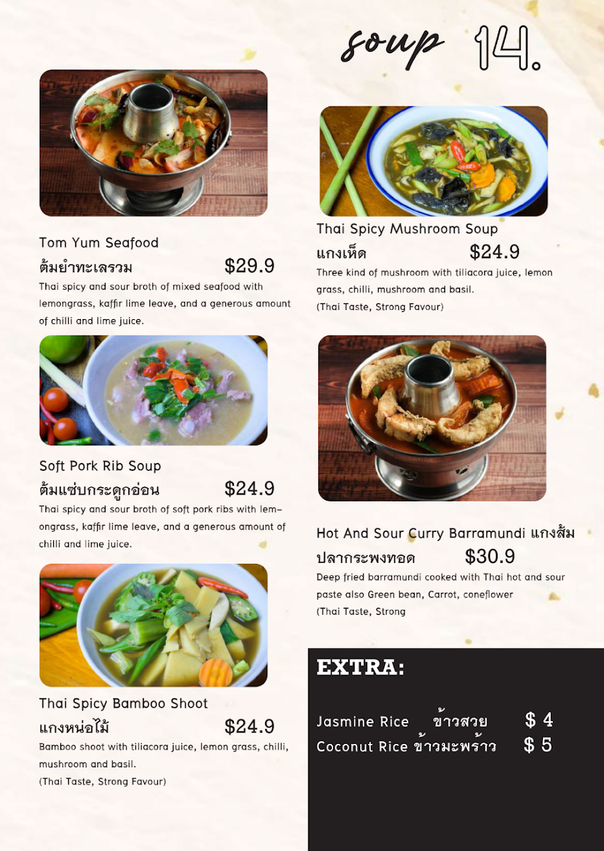 Made with thai spicy and sour broth of soft pork ribs with lemongrass, kaffir lime leave and a generous amount of chilli and lime juice.