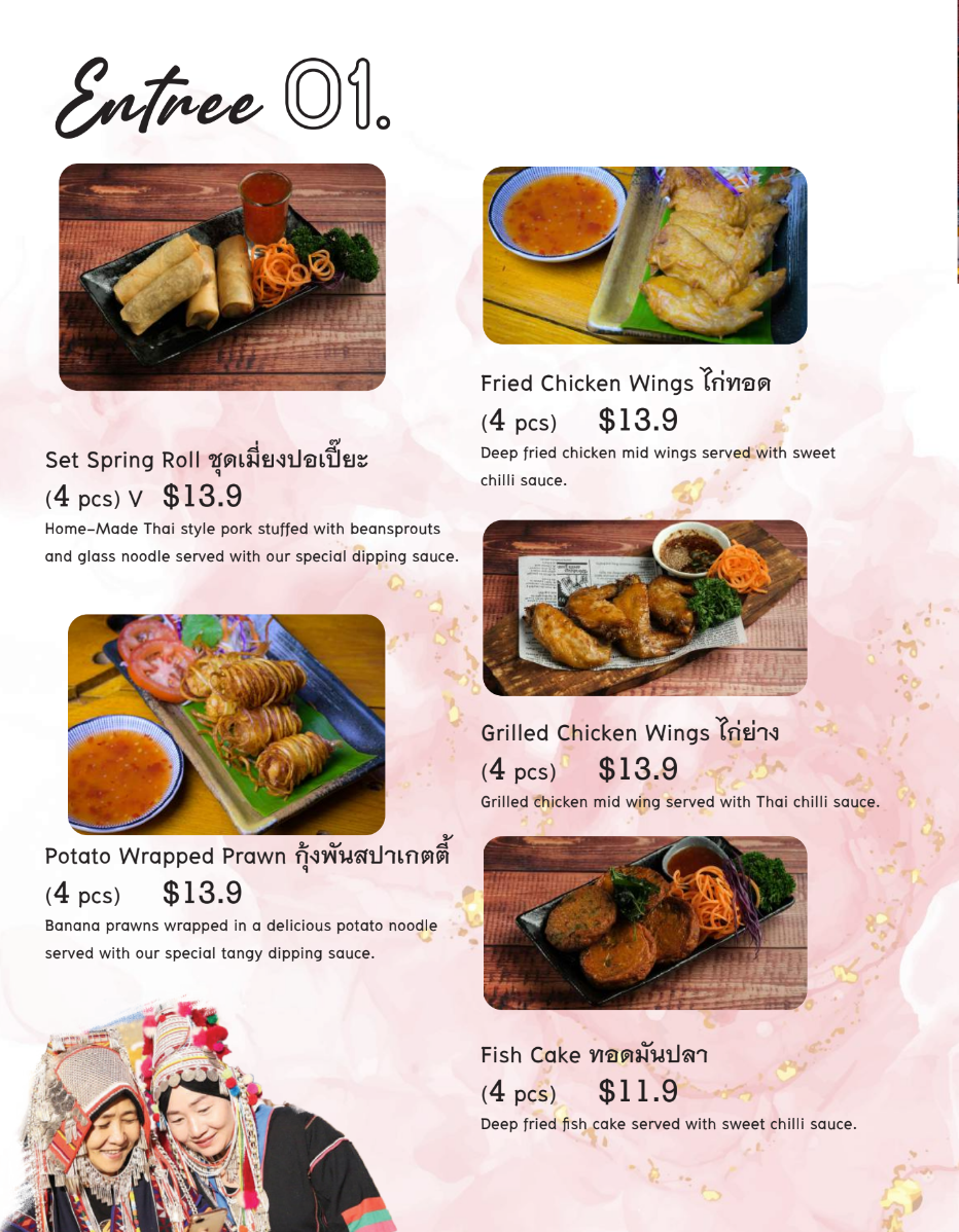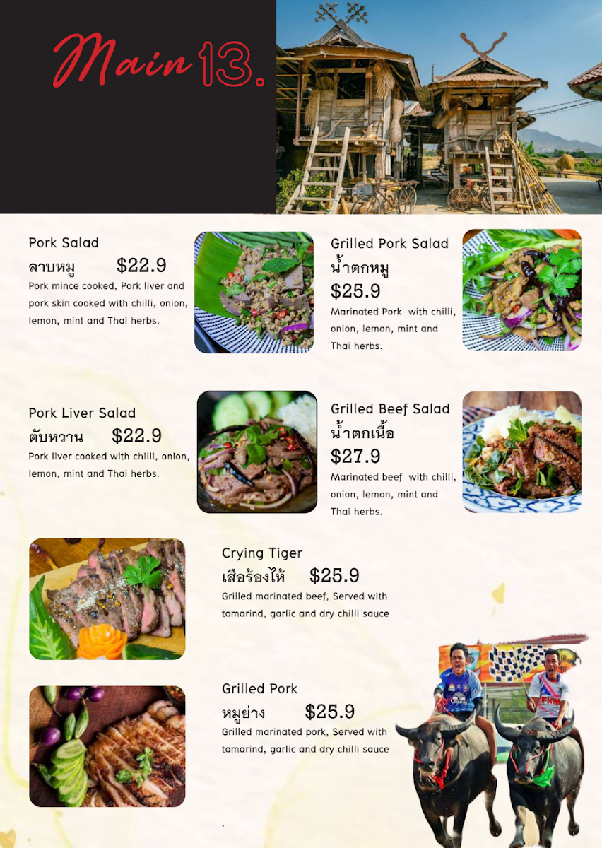 Made of pork mince cooked, pork liver and pork skin cooked with chilli, onion, lemon, mint and thai herbs.