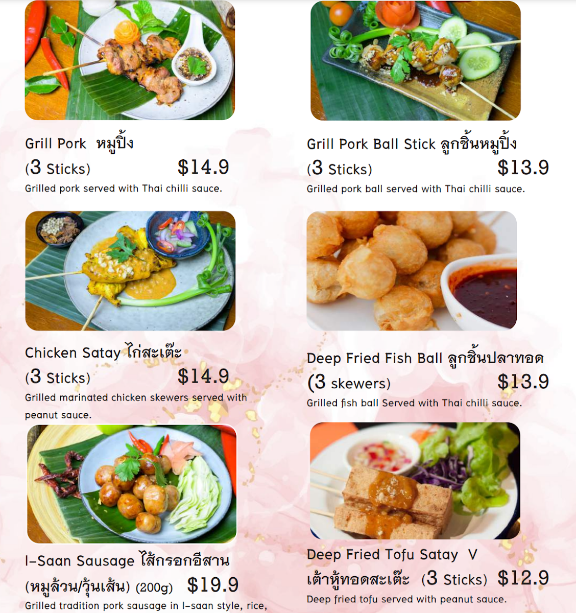 Spicy. Three sticks. Grilled pork ball served with Thai chilli sauce.